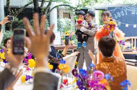 お二人の再入場の準備が整い、いよいよご入場☆ するとガーデ側のカーテンが開き、雰囲気ががらっと変わった3人が登場!! 会場のカラフルなお花と3人の衣裳のコーディネートの色合いがマッチし、春らしい華やかな再入場となりました☆ その後お二人は、ラウンドテーブルをスタートし皆様との歓談や写真も楽しまれ、笑顔溢れる素敵な再入場となりました!!