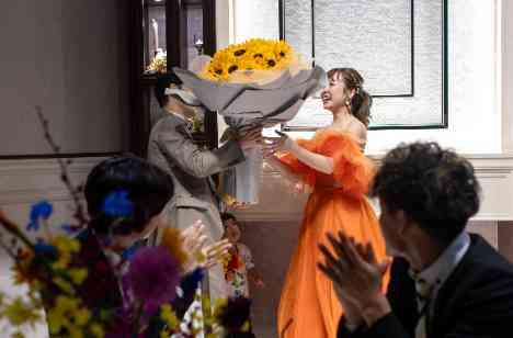 パーティ終盤、ご家族への感謝のお気持ちをお伝えしたお二人。皆様それぞれの想いがあふれ、感動の瞬間となりました。 そして、ご新郎様よりご新婦様へのサプライズ演出もスタート!! ご新婦様もびっくりしたご様子でしたが、想いのこもったお手紙と108本のひまわりの花束を受け取り、とても心温まるパーティ最後の素敵な演出となりました。