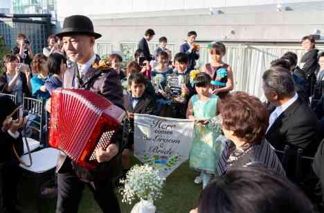 日差しが暖かなガーデンチャペルでの人前式でございました!アコーディオンの演奏と一緒に登場したのは、かわいいお子様キャストの皆様です♪新婦様お手製のウェルカムフラッグを持ってご登場していただきました。新婦様はガーデンウェディングにぴったりのラグラスが入ったかわいらしいブーケをお持ちになってご登場です!