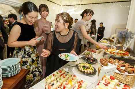 楽しいパーティタイムが進み、料理の最後はデザートブッフェがスタート☆ お二人が会場の扉を合図とともにオープン!!するとそこにはずらりと様々なデザートがたくさん♪♪ ホアイエ集まった皆様が楽しまれているお姿にお二人も笑顔が絶えません♡ 料理のフィナーレにはぴったりの楽しいデザートブッフェタイムとなりました♪