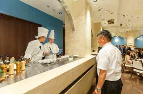 楽しいパーティタイムが進み、料理の最後はデザートブッフェがスタート☆ お二人が会場の扉を合図とともにオープン!!するとそこにはずらりと様々なデザートがたくさん♪♪ ホアイエ集まった皆様が楽しまれているお姿にお二人も笑顔が絶えません♡ 料理のフィナーレにはぴったりの楽しいデザートブッフェタイムとなりました♪