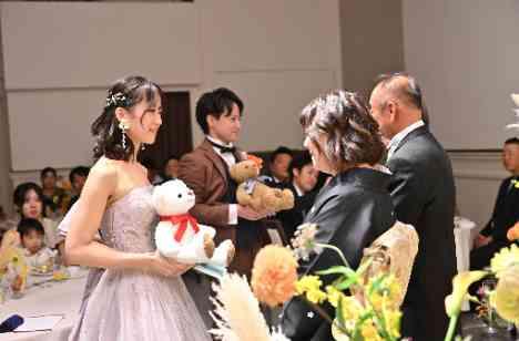 ご披露宴も結びに近づき、ご新郎様ご新婦様より今まで育ててくれた感謝のお気持ちとこれからもよろしくねの想いを込めてお手紙とウェイトベア、そして子育て感謝状を記念品として贈られました。ウェイトベアは生まれた時と同じ重さです。生まれた時のことを思い出させてくれ、子育ての1つの節目を感じることが出来た温かくて素敵な時間となりました。