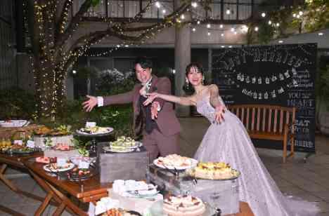 ラウンドテーブルの後、お二人はテラスに移動!テラスのカーテンがオープンすると、そこにはデザートビュッフェとお二人の姿が!ゲストからも喜びの歓声が上がります!テラスの木に飾られた電飾が綺麗に輝くテラスに並べられたカラフルなフルーツやケーキが鮮やかでフォトジェニックな空間に。ナイトガーデンならではの特別な空間にゲストの皆様とたくさんお写真を撮られていました♡