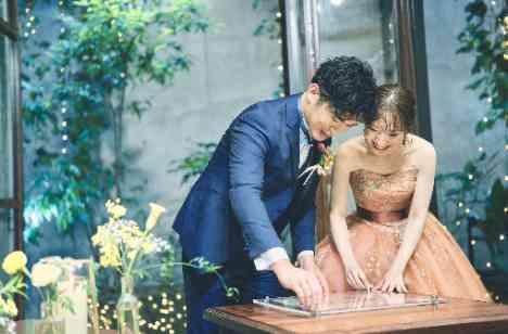 再入場はブルーのさわやかなタキシードとテラコッタのグリッターが煌めくドレスのおしゃれなコーディネートで登場♪ピンクや黄色、オレンジの入った暖色のブーケもコーディネートにとてもお似合いです!お二人はテーブルを回り、ゲストの名前の入ったプレートを結婚証明書に入れてもらいます。「どこにしよ~?」等楽しそうな声が聞こえてきますね。メインテーブルにてお二人のプレートも入れ、世界に1つの結婚証明書の完成です!