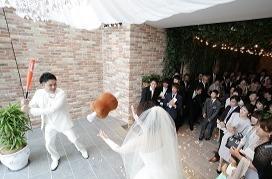 野球をされていた新郎様♪ 挙式後のフラワーコートでは、ご新婦様がブーケトスをすることが多いのですが、こちらのおふたりのご結婚式では新郎様のゲストにも盛り上がっていただきたく提案させていただきました ゲストへバットを使って大きなお肉のクッションを新婦様と協力しトス! なんとゲットしたゲストにはお肉をプレゼントしました! 演出は大盛り上がりで大成功