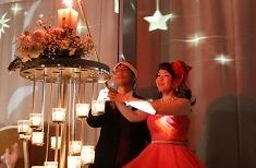 クリスマスがご結婚式の日から近いということから、新郎さんはサンタクロースの帽子を被り大きなプレゼント袋を背負って・・・そして新婦様は手作りの赤いハットを被り再入場 高砂につくとサンタクロースの大きなプレゼント袋と中から魔法のステッキが出てきておふたりの魔法の言葉「ハッピークリスマス!」の掛け声で・・・なんと!ゲストのテーブルにあったキャンドルが天下! 大盛り上がりの演出でした♪