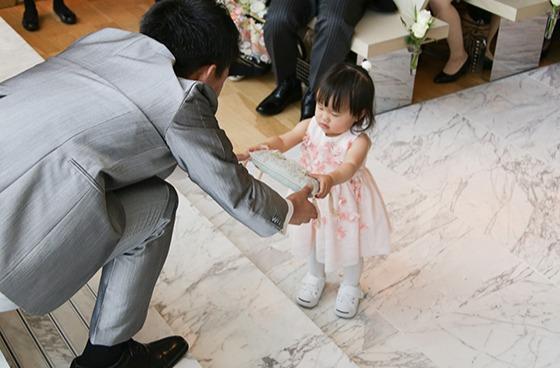 扉から出てきたのは笑顔で元気いっぱいのリングガールちゃん!緊張した空気を一気にやわらげてくれるリングガールちゃんの存在のお陰で、おふたりだけでなくゲストの方々皆様の緊張までもをほぐしてくれ、その場にいた皆様えお笑顔にしてくれました。