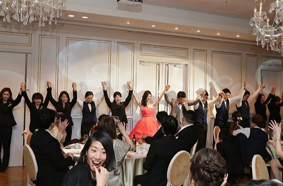 当会場では【オールキャストフィナーレ】がございます。新郎新婦様とともに、キャスト一同がゲストの皆様の前で最後にもう一度盛り上げるシーン!突然のサプライズに、今までこんな結婚式行ったことがないと、ゲストも皆さまも大喜びです♪