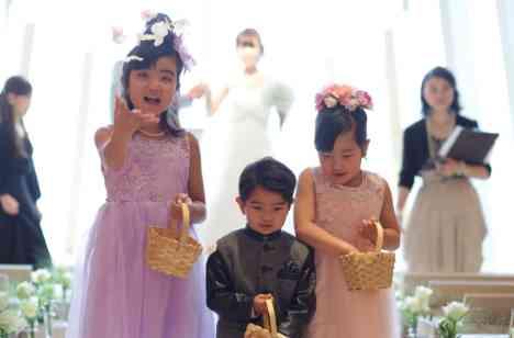 挙式ではおふたりのご親族のお子様ゲストが、フラッグボーイ・リングガール・フラワーガール&ボーイを務めてくださいました。お子様たちの一生懸命な姿に、会場は自然とゲストの皆さまの笑顔に包まれ、素敵なシートなりました。