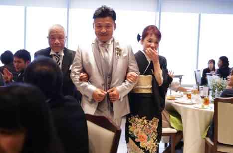 お色直しのご中座はご新郎様のお父様と叔母様とご一緒に。ご新郎様にお顔がそっくりなお父様ととっても陽気で明るい叔母様とのご中座は、ご新郎様とおふたりはもちろん、ゲストの皆さまの記憶にもきっと残る温かいお時間となりました。