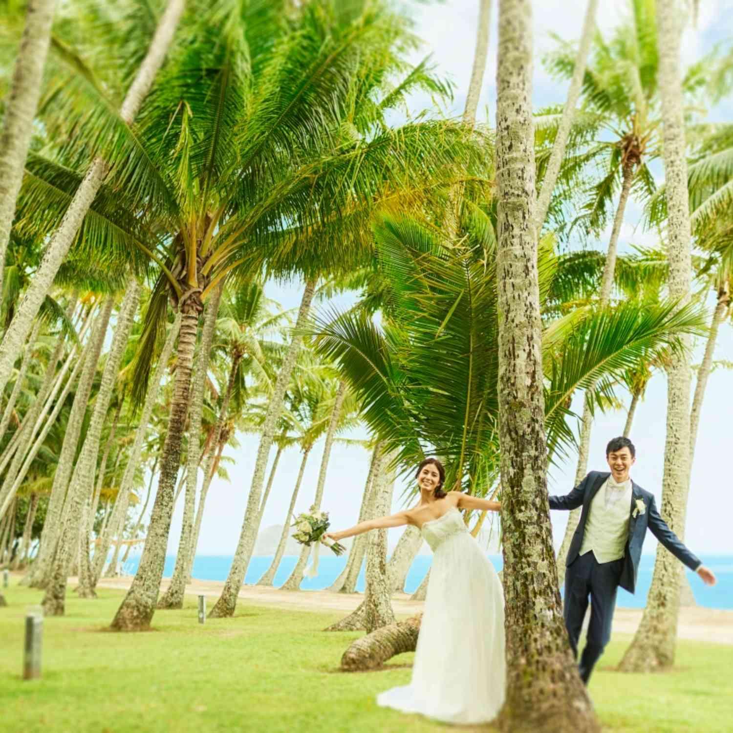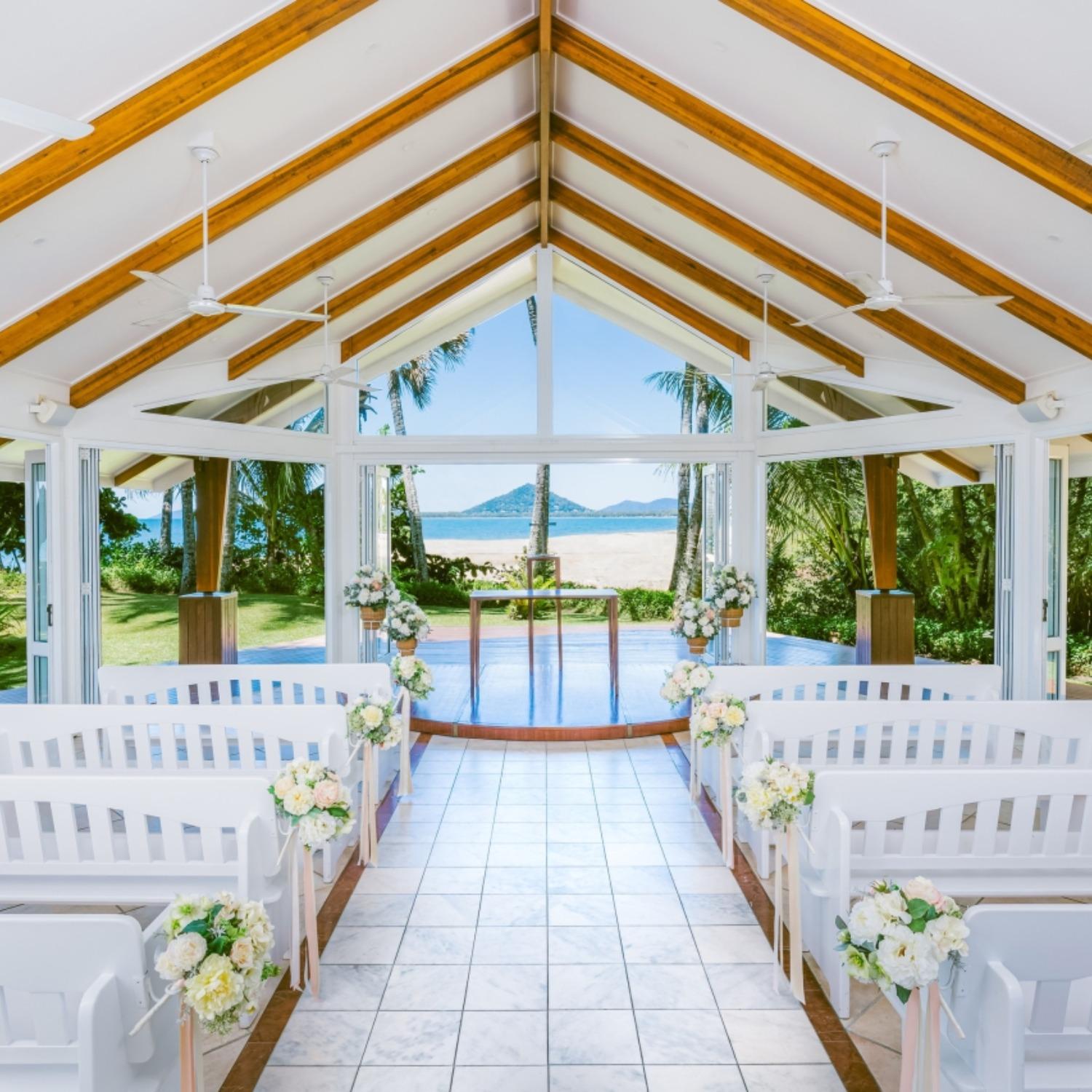 パームツリーに囲まれたガラス張りのチャペル内からは、180度の紺碧の海を眺めることができます。グレートバリアリーフの入り口とされるケアンズで、憧れのオーシャンビューウェディングが叶います。