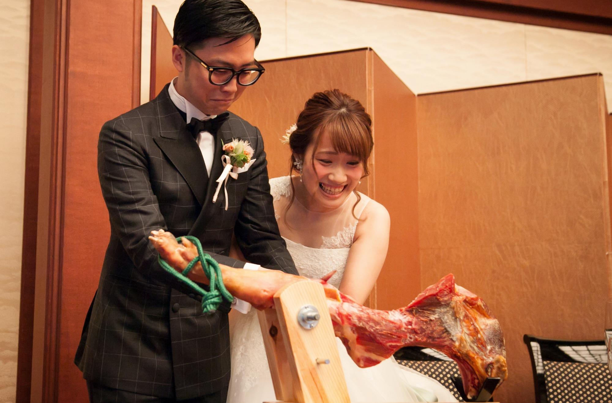 細部まで趣向を凝らし、皆様に喜んでいただく宴を計画されました。ペーパーアイテムは新郎様のデザイン。豊臣秀吉をイメージしたゴールドの席札には、おひとりずつにキャッチコピーが添えられ、ゲストの方が感激されるシーンも。宴がはじまると、ケーキ入刀ならぬ「生ハムご入刀」や、デザートビュッフェならぬ「デザート&おつまみビュッフェ」など、おふたりらしいアイデアが盛りだくさん。会場は終始、笑顔に包まれました。