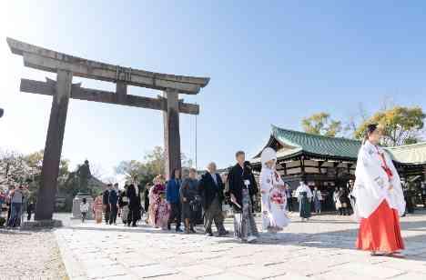挙式は、“神前式”をご選択されたおふたり。誓いの舞台は、大阪城敷地内にある『豊國神社』をお選びになりました。 大阪では、ちょうどこの日に桜の開花宣言が出され、日本の春を味わっていただくには絶好の日和でした。 古式ゆかしい厳かな神前式は、海外のゲストはもちろん、日本のゲストにとっても貴重な経験に。 ゲストにあたたかく見守られながら、夫婦の誓いを交わされた新郎様新婦様でした。