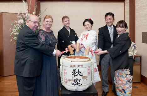 会場コーディネートのテーマは、“日本の春”。桜の花をふんだんに取り入れ、奥ゆかしく優雅な“日本の美”を表現されました。 披露宴は鏡開きで華々しくスタート。ご両家の親御様とともに「よいしょ!よいしょ!よいしょ!」の掛け声のもと、鏡を開いていただきました。 開いた樽酒をゲストの皆様と酌み交わしたことで一体感がうまれ、会場は一層あたたかなムードに。国境を越え絆が結ばれた、印象的なシーンとなりました。