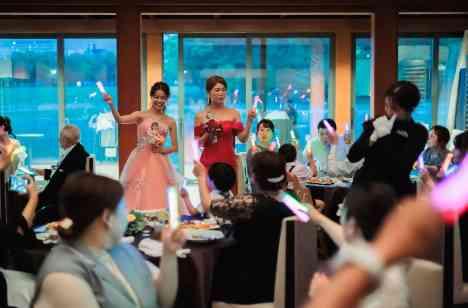 披露宴の中盤では、カラードレスにお召替えされたおふたり。お母様が一針一針に想いを込めて手作りされた編みぐるみをお手元に、会場へとご入場されました。 ゲストには、おふたりがお召しになるドレスの色を予想していただき、正解だと思う色のペンライトを振っておふたりをお出迎え。光の華やかな演出は、会場のロマンティックなムードと一体感をさらに高め、大盛り上がりのシーンとなりました。