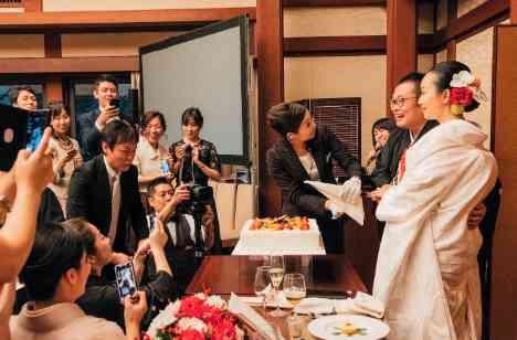 純和風の会場に合わせ、お嬢様は袴風の衣装をお召しに。和風フォトプロップスや装花は紅白になさるなど、あらゆるところに和の要素を取り入れられました。ウエディングケーキには、新郎様がお勤めの食品メーカーの材料を使用。華やかな前菜「海の幸のジュレ~ひまわり~」をはじめ、おふたりが試食し、選ばれたお料理にゲストの皆様が舌鼓を打たれていました。