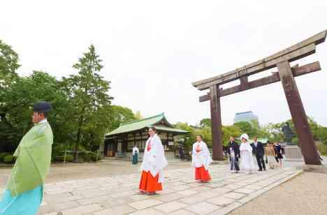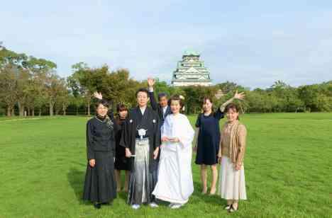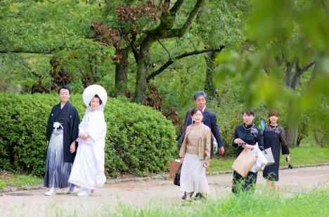新郎様が毎年初詣で豊國神社にお参りに行き、お茶会を豊國神社でされたこともある為、おふたりはゆかりの深い豊國神社で挙式を執り行われました。緑溢れる園路を、一歩ずつ歩みを進められ、白無垢を身にまとった日本の花嫁を象徴する晴れ姿は、歴史深き大阪城のロケーションにふさわしい、ご立派なお姿でした。挙式の感動が覚めることなく、ご会食会場の大阪迎賓館までの道のりを、ご家族様と一緒に満喫されていらっしゃいました。