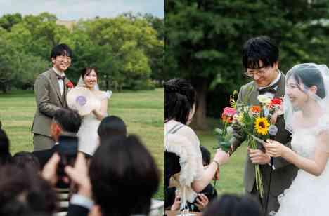 青空が広がる初夏の一日、おふたりの挙式はファーストミートから始まりました。笑顔を交わす姿はリラックスした雰囲気に包まれ、ガーデン挙式では「ブーケストーリー」を実施。ゲストから一輪ずつ花を受け取り想いを伝える新郎様に、会場は感動に包まれました。ゲスト全員の署名入りレコードにおふたりもサインを加え、世界に一つだけの結婚証明レコードが完成。バブルシャワーが輝く中、笑顔あふれる門出となりました