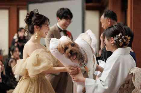 お色直しでは、新婦様が柔らかな雰囲気にぴったりのウォームベージュドレスで登場。ガーデンからのサプライズ入場に、会場は歓声に包まれました。ゲストとの語らいを楽しんだ後、結びには親御様への感謝の手紙を朗読。生まれた時と同じ体重米と、ご両家の愛犬をデザインしたビッグクッションを贈呈し、笑いと涙に満ちたかけがえのない一日となりました。