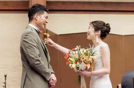 お色直し入場では洋装にお召し替えになり、洗練されたおふたりの姿に会場から大きな拍手が起こりました。続いてはゲスト参加型の「ダーズンフラワーセレモニー」。ゲストからの12本の花を集め新郎様がブーケを作り、プロポーズの言葉とともに新婦様へ贈られました。新婦様の好きな暖色系オレンジのお花で完成したブーケを手にする新郎様の誇らしげな表情が印象的でした。
