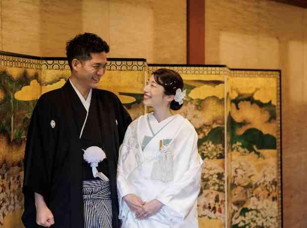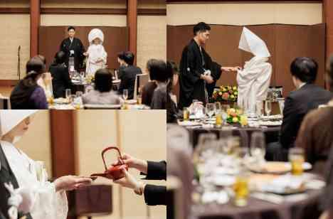 ファーストミートから始まった特別な一日。白無垢姿の新婦様と対面した新郎様の目には涙が浮かび、互いを見つめ合う姿が心震えるワンシーンとなりました。 挙式は当社オリジナルの「人前和婚式~縁~」。愛猫・がんもちゃんの肉球スタンプを添えた結婚証明書で誓いを交わし、ご家族皆様と盃を酌み交わす「三々九度」の儀も執り行われ、会場は温かな笑顔に包まれました。