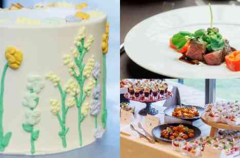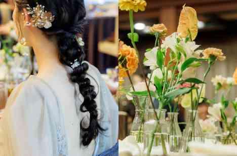 披露宴の中で、自然とゲストの視線が集まっていたのが、会場の装花とやさしく調和するウェディングケーキでした。オレンジ系の色味を基調に、表面には可憐なお花のペイントを施し、思わず眺めたくなるようなあたたかさのあるデザインに。装花とリンクしたデザインは、会場全体の統一感を高め、おふたりらしさを表現するアイテムのひとつとなりました。