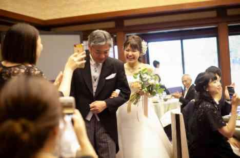 お色直し入場では、まず新郎さまがゲストのみなさまから祝福の言葉とともに深紅のバラを集められる「ブーケストーリー」でご入場されました。続いて、お父さまのエスコートでご入場された新婦さま。これまで白無垢、色打掛と和の衣裳でお過ごしだった新婦さまは、シンプルで上品なウエディングドレスにお召し替えされました。神前式ではかなわなかった、お父さまと歩きたいという想いをかなえられた瞬間でした。