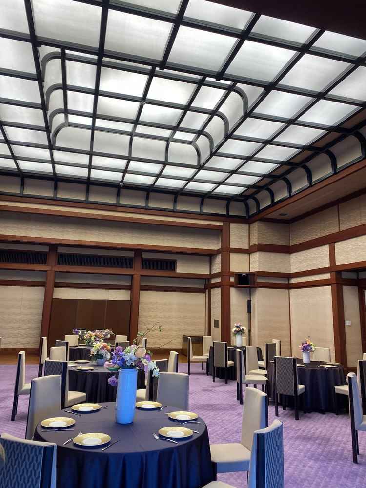 天井がとても広く、外の景色が見えるので会場が質素でも問題なさそうでした。ただ季節によってイベントなどで庭園への人の出入りが多かったり、イルミネーションがあったりと見学時と式当日は違う雰囲気になっている可能性があるな、と思いました。