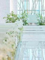 白の大理石でつくられた純白のバージンロード。陽光でキラキラと輝くバージンロードにウェディングドレスのトレーンもよく映える。透明感のある真っ白な空間に、美しい曲線を描くブルーのステンドグラスが陽の光で輝く姿はとても神秘的な雰囲気に