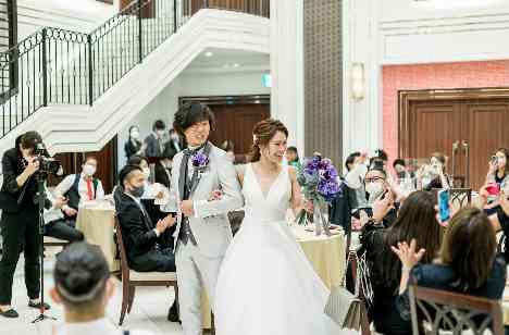 「大きな白い階段を歩くのがずっと夢で実際に見学に行った時とてもステキで気に入りました。料理も美味しく、披露宴会場は天井が高く圧迫感のない広々とした会場で、大きな階段もありとてもステキです!」と。新型ウイルス感染症を心配され、大人数でのパーティはご友人のみにされ、大切な親族の皆様とだけのパーティはとってもアットホームなお時間になりました。