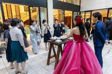 コロナウイルスで二次会をやらないことにしたので、「何か一つくらい、、」と、最終的に景品付のじゃんけん大会を開催!また、デザートビュッフェは都会とは思えない滝のあるガーデンの前で「みんなでワイワイできるのもとても良かったです」と新婦様より。「私たちは今回本当にとっても素敵なスタッフさんばかりにサポートして頂きました。式場選びもご縁だと思います。私たちはここで結婚式が出来て一生の思い出になりました。」