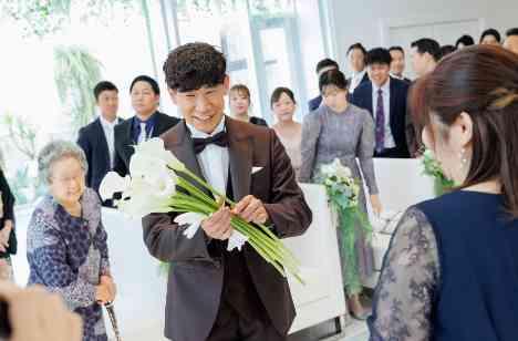 大切なゲストの中から 指名させて頂きました12名の人から花を受け取り、 その集めた花をブーケにし、 花嫁にプレゼントして返事の代わりに1輪返す セレモニーをしました。 その他、ジャケットセレモニーや 友人からの問いかけで誓いの言葉、 ウエディングツリー、リングキッズなど 人前式だからこそ、私たちの好きを沢山詰め込みました。