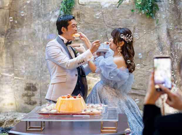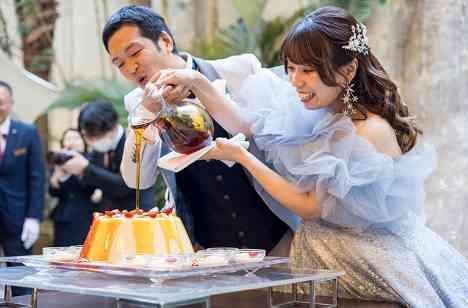 ケーキ入刀ではなく、大好きなプリンに2人でカラメルソースをかけて完成させるセレモニーにしました♡ プリンを口いっぱいに頬張る事ができて幸せ~~ また、披露宴会場にあるガーデンで行ったので360度ゲストに囲んでもらい写真や動画も沢山撮ってもらえて、本当にやってよかった演出です! ゲストにはミニプリンでデザートビュッフェの際にお裾分けしました♡♡