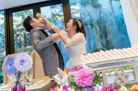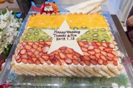 おふたりの交際のきっかけは、ミャンマーでの研修。そんな馴れ初めを披露宴で取り入れたい!ということで、お打ち合わせから盛り上がったのが、このミャンマーの国旗型のケーキカット!! 衣裳をまとったスタッフが、国旗型ケーキをお持ちした途端、会場は「何?何?何~??」という反応。おふたりは大爆笑でしたね!!