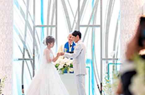 他にはないブルーのステンドグラスと白貴重のチャペルでの挙式。「緊張で歩調が合わないかった…」笑いありの状況で場が和んで心がほぐれたんだとか♡高い祭壇から、みんなの表情もよく見えてよかったと新婦様。挙式後は全天候型の大階段でアフターセレモニー。光あふれる空間でフラワーシャワーやブーケトスも満喫。