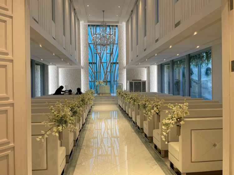 スクリーンはもちろんありますし、チャペルに子供室がついていたり、大階段に巨大モニターがあったり充実しています。