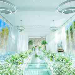 天井高9mのガラス張り純白チャペル。自然光がたっぷりそそぎ、きらめくガラスのバージンロード。
