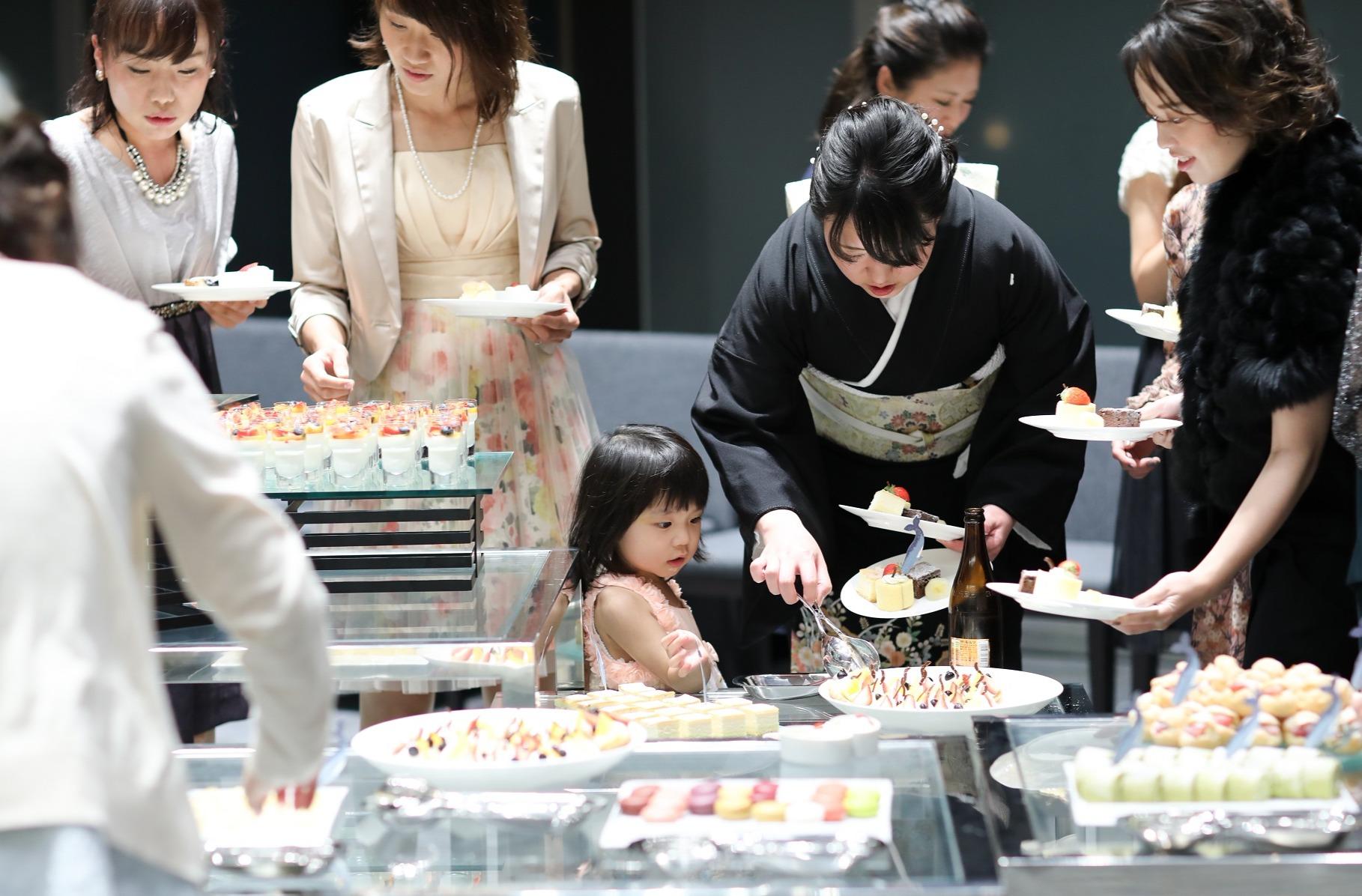 おふたりのウェディングケーキはなんと…! ジンベイザメのケーキ! かわいらしいジンベイザメのケーキに にこにこ笑顔のケーキ入刀で会場内は大歓声♪ そして女性に大人気のデザートブッフェを取り入れたおふたり。 普段話す機会が少ない方ともケーキを取りながらお話しされていました。