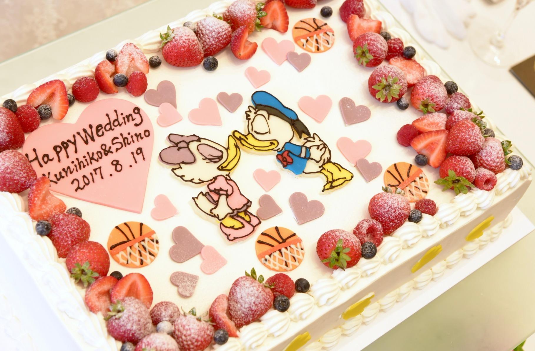 ドナルドが大好きな新婦様。受付だけでなく、ウェディングケーキにも ドナルドが♪とーってもかわいいケーキに皆様もほっこり笑顔に。 さらにカラードレスはベルをイメージしたイエロードレス。 プロジェクションマッピングを利用したロマンチックな星空の下 階段からの再入場でディズニープリンセスのよう…☆