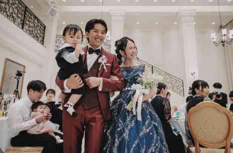 ゲストの皆様にご投票いただいた新郎新婦様のお色直し衣裳色当てクイズ。その素敵なお2人はテーマカラーのブルードレスと、それを際立たせるワインレッドのタキシード。何より皆さまのご注目をさらったのは、愛する我が子。奇しくもこのご結婚式のアイドルはお2人のご長男でもありました。全てのテーブルへフォトラウンドをされましたが、皆さまとのお写真タイムを絶対取りたい!というお2人の願いがかなった瞬間でした。