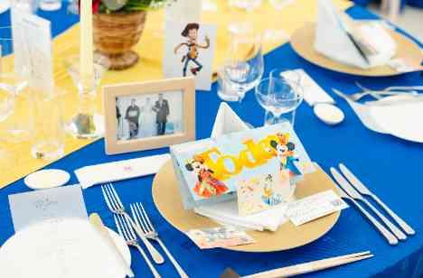 ディズニーが大好きなお二人がこだわって考えられたテーブルコーディネート。 テーブルクロスはブルーにゴールドのランナーを掛けて 美女と野獣カラーに♪ ゲストの皆様にもワクワクしてもらえたら良いな♪という想いからテーマパークにいるようなガイドマップ風の席次表やチケット風の席札にゲストの皆様も笑顔がこぼれていました!