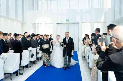 新婦様の「過去」「現在」「未来」を表しているとも言われているバージンロード。 ラ・メゾン Suite ではお父様とお母様3人で一緒に歩いていただけるような幅になっています。 産まれた時の感動やご家族で歩んで来られた今日までの道を思い出しながら 新郎様の元へと進む一歩一歩に思いを馳せます。 テーマカラーのブルーバージンロードも映えますね♪