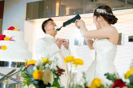 ウエディングケーキのファーストバイト! 新婦様から新郎様への一口を何かおもしろいグッズで食べさせる事はできないかな!?と考え抜かれたAさんはYさんのご職業で使うピストルに大きなスプーンをつける事に♪ 大きなケーキを口に運ばれ 更にタジタジなYさんでした♪ お二人の思い出のアイテムやご職業にちなんだアイテムを使うとより特別なファーストバイトになりますね!