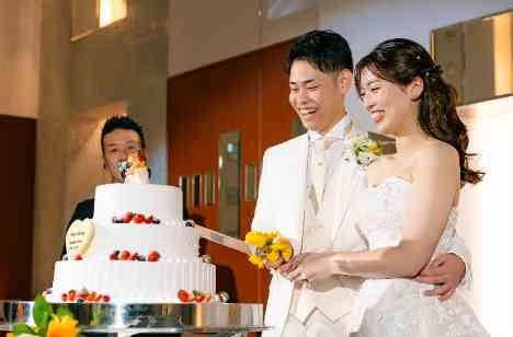 披露宴がはじまりケーキ入刀のお時間になりました!息ピッタリなお二人とキャプテン♪お気に入りの音楽の盛り上がるシーンでケーキ入刀♡ケーキの入刀には新郎新婦様が夫婦として初めて行う「共同作業」であり これからの生活の豊かさや 結婚を祝福してくれるゲストへ幸せを分け合う「幸せのお裾分け」という意味がございます☆