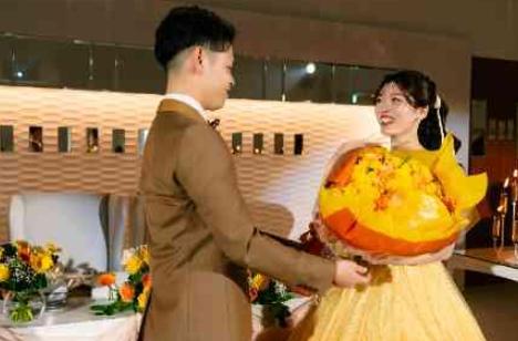 披露宴も順調に進み結びのシーンの前に新郎Tさんから新婦Aさんへサプライズで花束をお渡しされました♡新婦Aさんは「結婚式で花束をもらうことが夢」だとおしゃっておりましたのでとても幸せそうな表情をしていますね♪新婦Aさんの好きな黄色とオレンジ色のバラのお花!ドレスの色とマッチしていてとても素敵ですね♡黄色のバラには「感謝」という意味が込められています☆