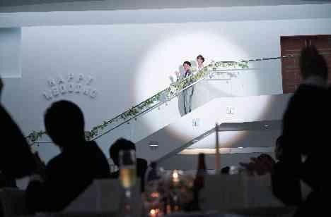 披露宴の入場ではあこがれであった階段から入場をしていただきました。 しっかりと新婦様をエスコートする新郎様 すごくかっこよかったです 新郎新婦様が階段中段に着いた際にはゲストの皆様もこのシャッターチャンスを逃さないとカメラを構えてたくさん撮影されておりました。