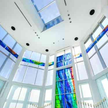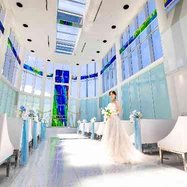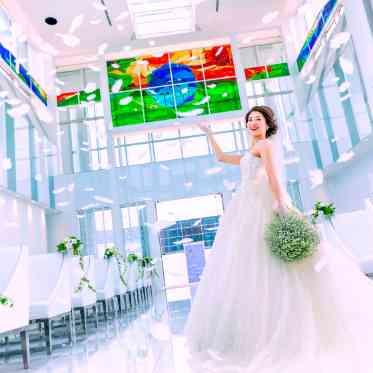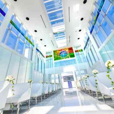 日本初上陸のスペイン製ステンドグラスが輝くチャペルで、幻想的な誓いを交わそう。チャペルのバージンロード幅は約2.5m。スペイン製ステンドグラスが輝く下で、親子三人で歩くことも可能。