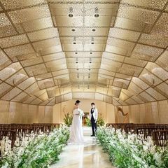 バージンロード15m、アーチ型の天井デザイン。まるでウエディングヴェールのレースに包まれたような幻想的な空間で感動のセレモニー。ふたりを優しく包み込み「永遠の愛」に