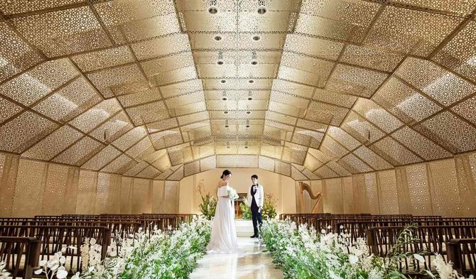 【他にない幻想的なチャペル挙式体験】最上階にはまるでレースに包まれたようなドーム型の造りのチャペルが。光あふれる幻想的な空間が魅力です。ドレスや白無垢が映える花嫁が美しく見える「特別なポイント」をチャペル挙式体験で確認!