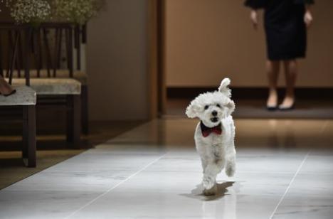 家族とゲストの皆様からも黄色い歓声が…みんなのアイドル「リングドックの登場♡」 お二人の大切な家族のワンちゃんがお二人のもとへリングを持ってくるお手伝いをしてくれました! 蝶ネクタイを付けて、フォーマルにおめかし… その愛らしい雰囲気とお二人めがけて駆けてくる様子に、ゲストの皆さまもメロメロでした♡
